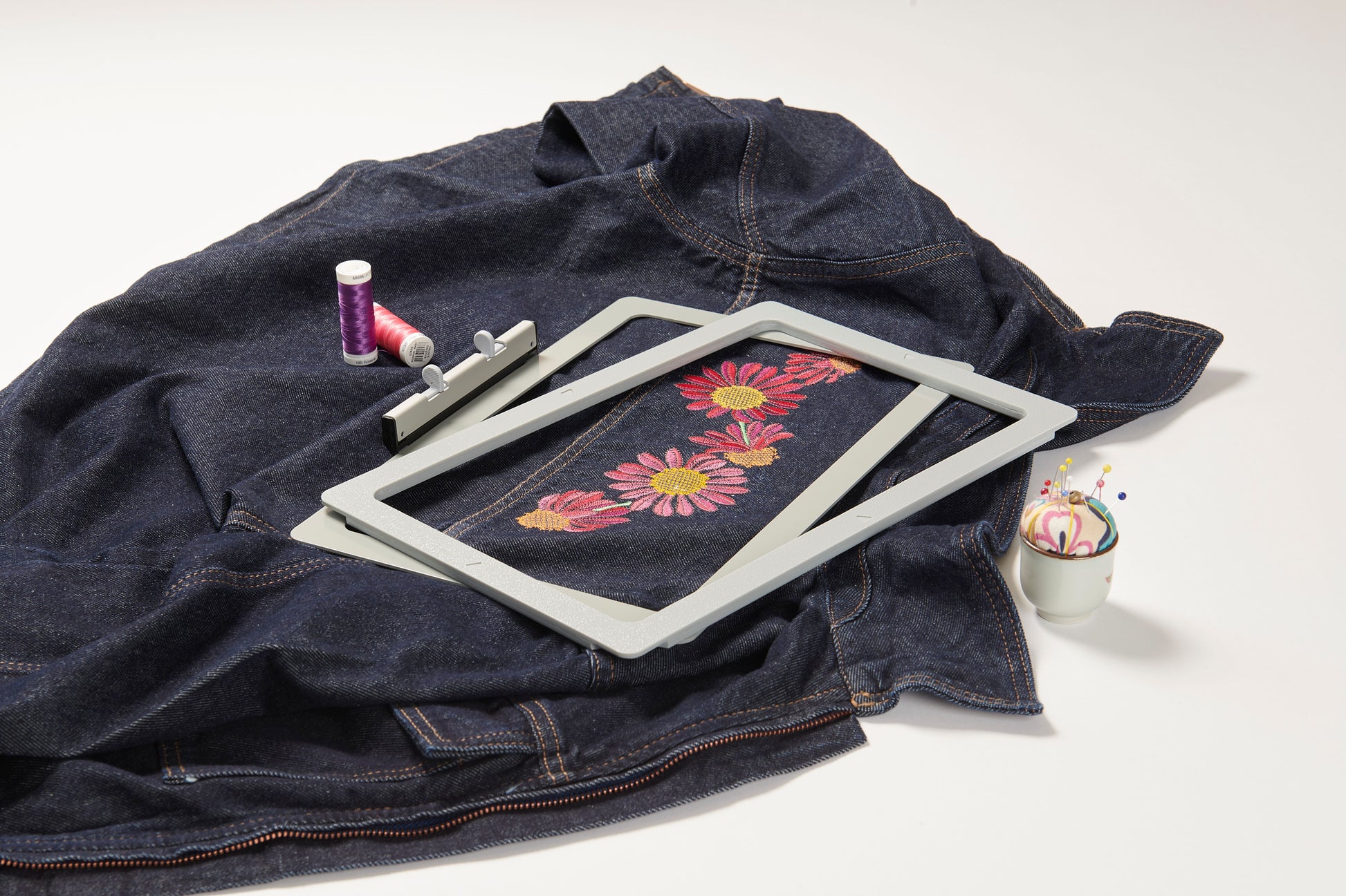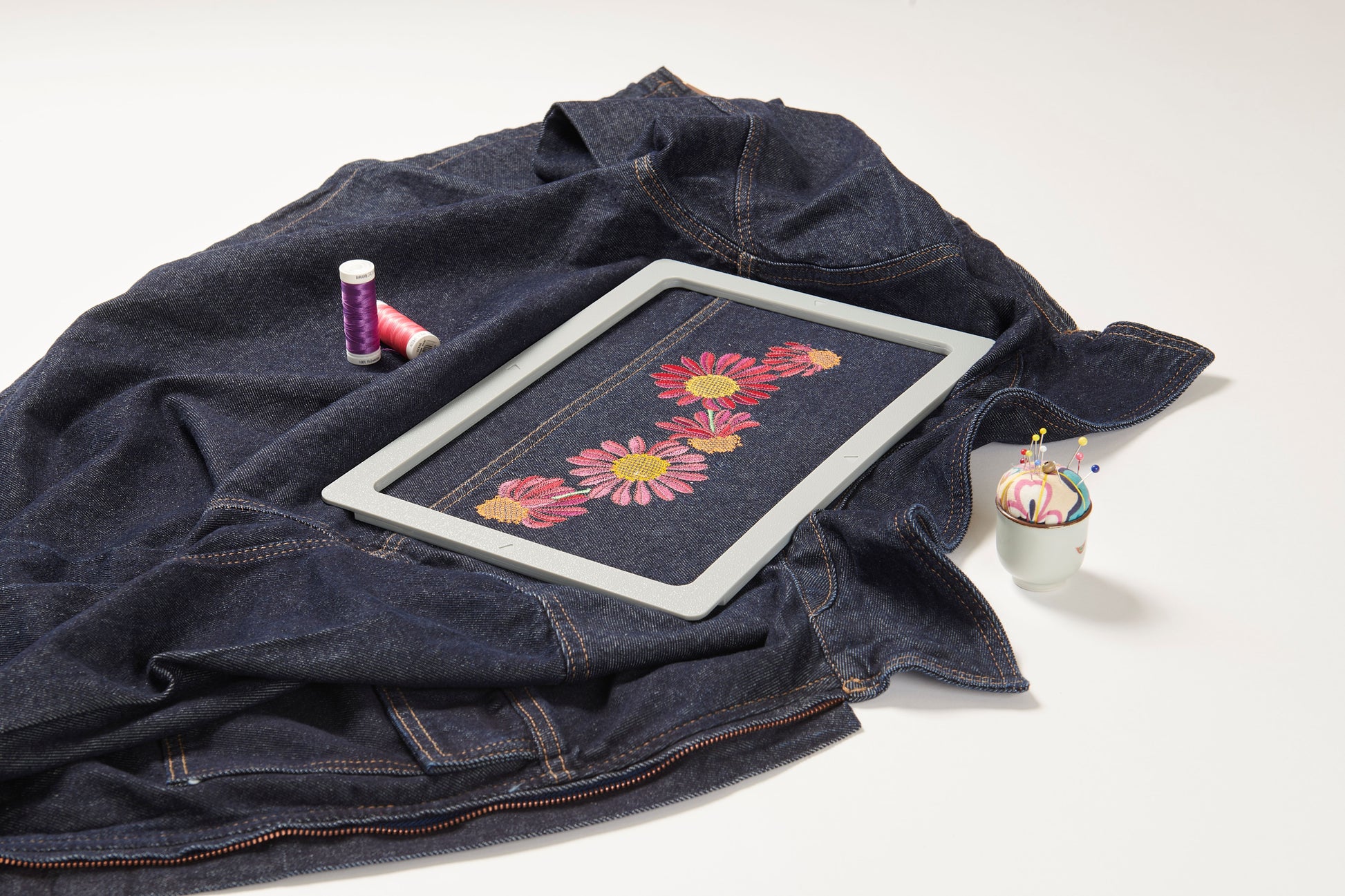 Because of its easy handling, even more bulky items such as jackets, caps or shorts can be comfortably hooped in the Magnetic Embroidery Hoop.