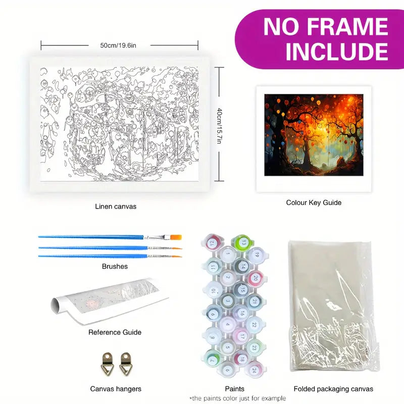 💎Complete Set: Comes with 1 * Painting canvas, 3 * Brushes, 2 * Hangers, 1 * Color guide, 1 * Instruction sheet, and 1 * Set of acrylic paints.