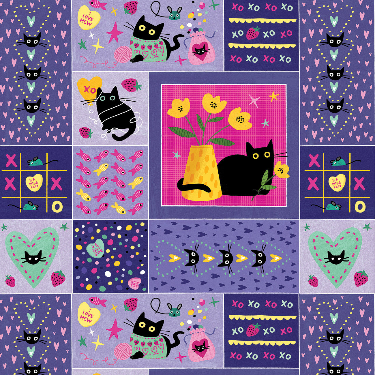 This vibrant fabric design features a delightful patchwork of playful cat-themed illustrations, perfect for adding a whimsical touch to any project. The central motif showcases a black cat lounging beside a vase of yellow flowers, surrounded by smaller panels with various cat-related designs including hearts, fish, and tic-tac-toe games