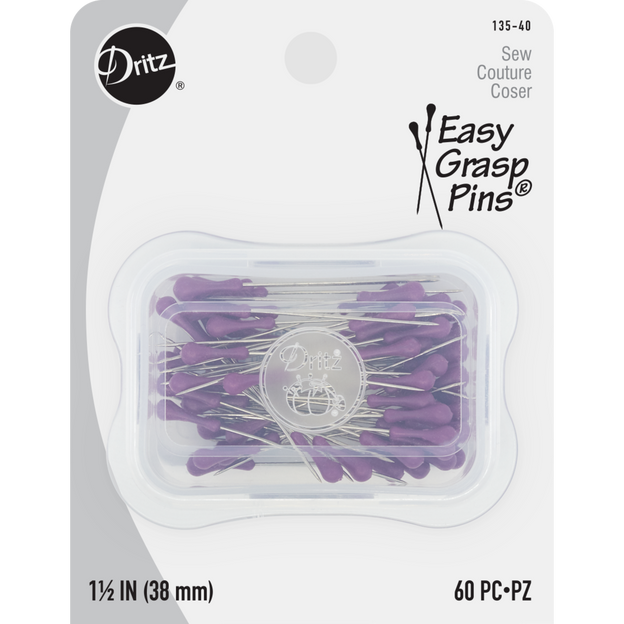 Dritz Easy Grasp pins are straight pins for sewing, quilting and crafts; they feature an elongated ball head with an indented base that provides more area to grasp and grip pin.