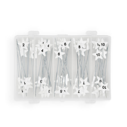 Dritz Quilting flat head pins are straight pins with white star-shaped heads; the star-shaped heads are printed with numbers or directional arrows for use in organizing quilt pieces.