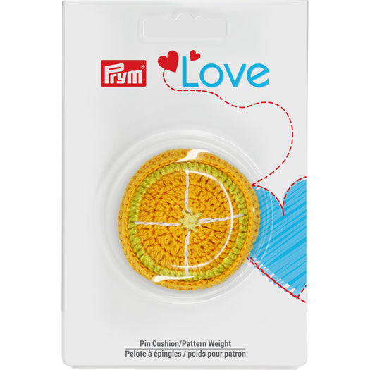 Prym Love Pin Cushion/Pattern Weight is a cute orange. Can be used as a pattern weight or pin cushion. Each crocheted cushion weights about 0.8 oz and will keep your pattern pieces in place as you work. Functional and fun!