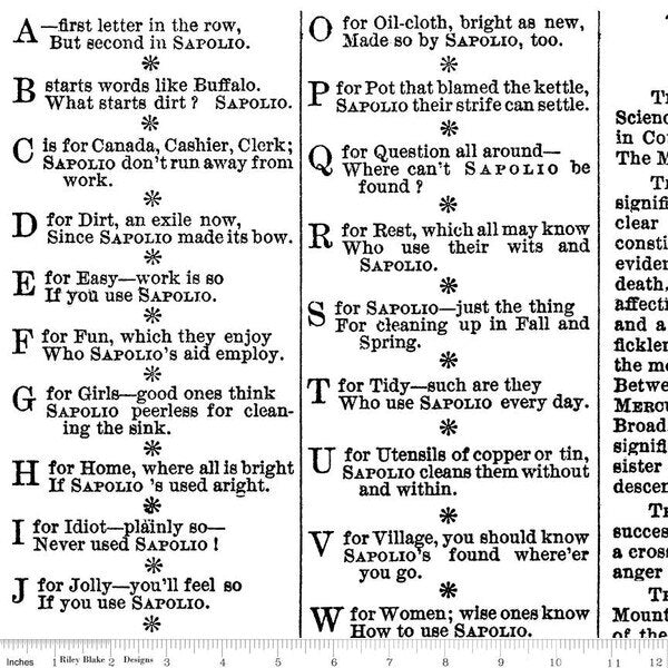 Item Description: Queen of We'en by J. Wecker Frisch for Riley Blake Designs is great for quilting, apparel and home decor. This text print features ad slogans for Sapolio soap and information on the art of palmistry.